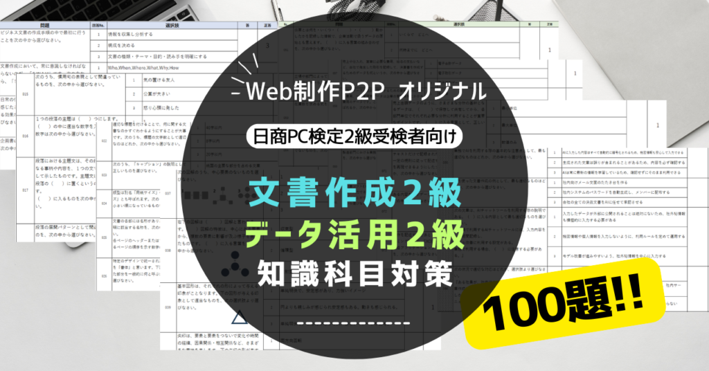 2025.12 公式LINE登録者へ Web制作P2Pオリジナル制作 日商PC検定2級対策(データ活用2級・文書作成2級)知識問題100題 無料ダウンロード(登録者以外のダウンロードが確認できたので配布を中止します💦2025.12.08)