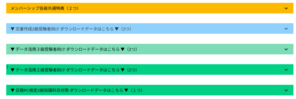 データ活用各級・文書作成2級受験者に必要な情報をタップリ準備しました!(下図が特典見出し)